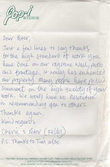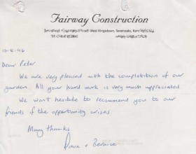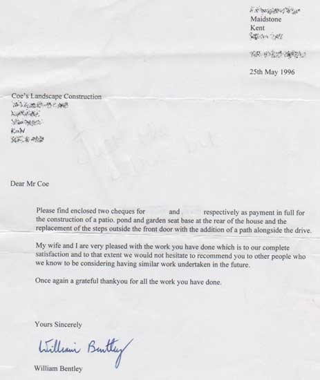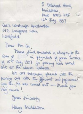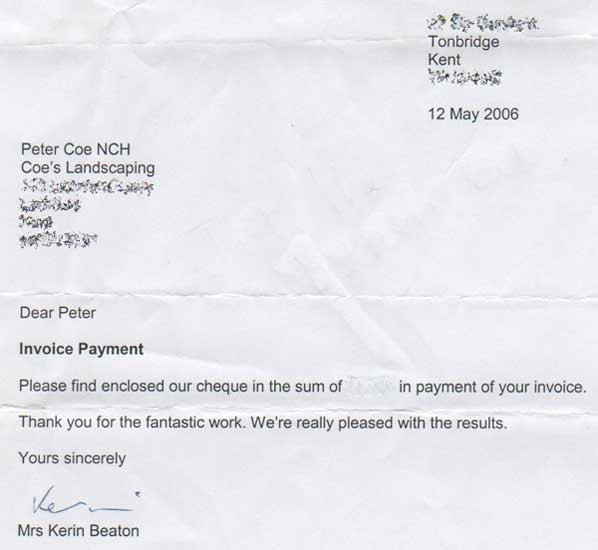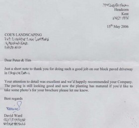 Coes Landscaping prides itself in a history of happy customers, this is demonstrated in the letters sent to Mr Coe following completed work.